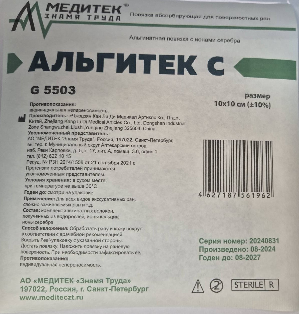 7. Альгинатная повязка с серебром (Альгитек С) дополнительно обладает мощным антибактериальным действием и создает высокоэффективный антимикробный барьер.