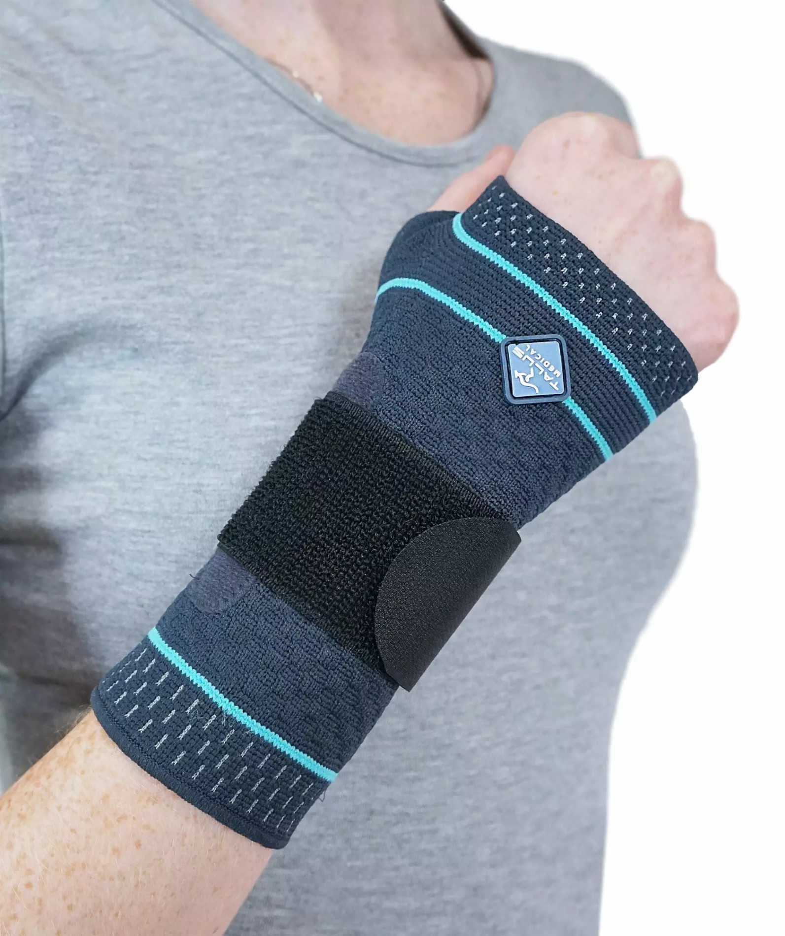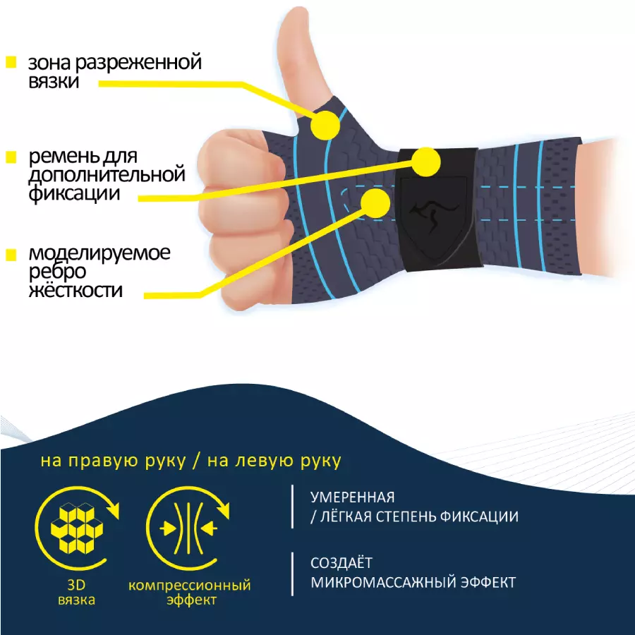 Плосковязаный бандаж со съёмными элементами фиксации (ремнем и ребром жесткости - шиной) и мягкой зоной в области большого пальца подходит для разных этапов лечения и профилактики заболеваний и травм лучезапястного сустава. Может обеспечивать умеренную и/или легкую фиксацию. Мягкий микромассажный, компрессионный и проприоцептивный эффекты ускоряют процесс реабилитации.