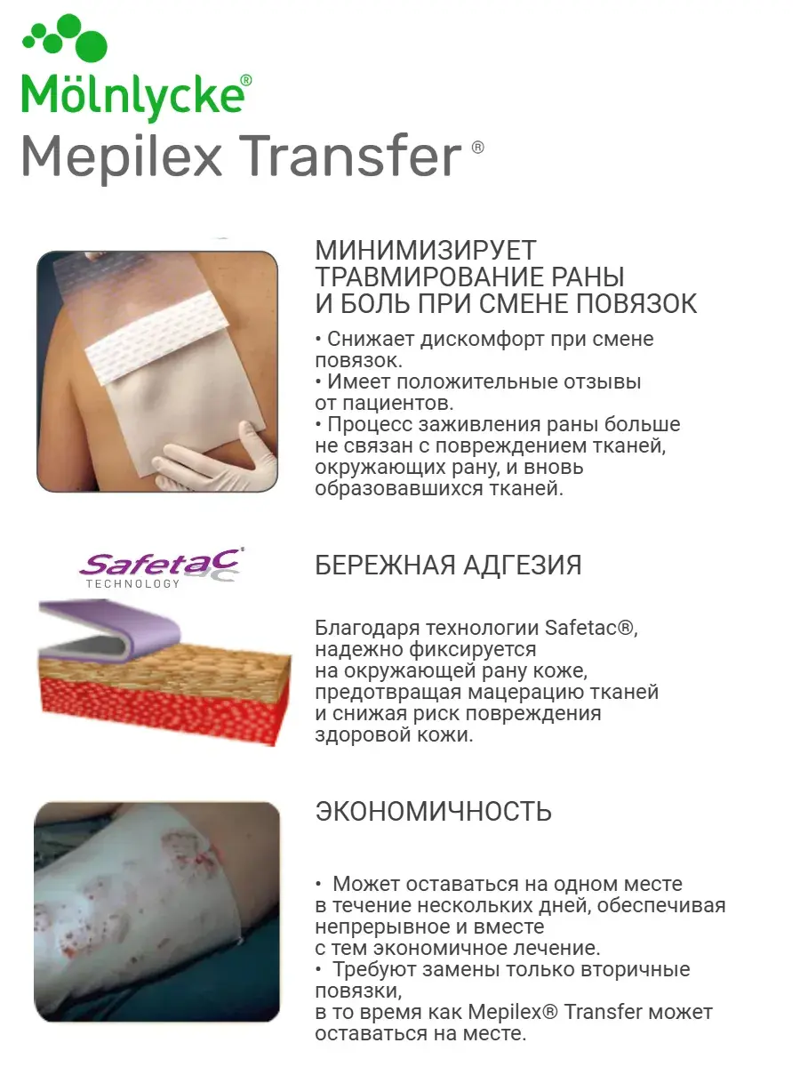- Может оставаться на одном месте в течение нескольких дней, обеспечивая непрерывное и вместе с тем экономичное лечение. Требуют замены только вторичные повязки, в то время как Mepilex® Transfer может оставаться на месте.